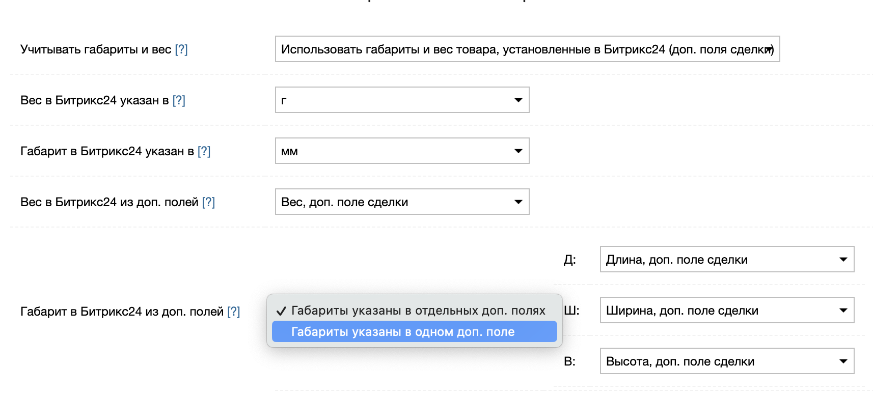 Данные настройки отвечают за корректную передачу значений веса и габаритов из Битрикс24 в СДЭК. На основании этих настроек будет рассчитаны параметры отправления в виджете приложения и при автоматическом создании накладных.